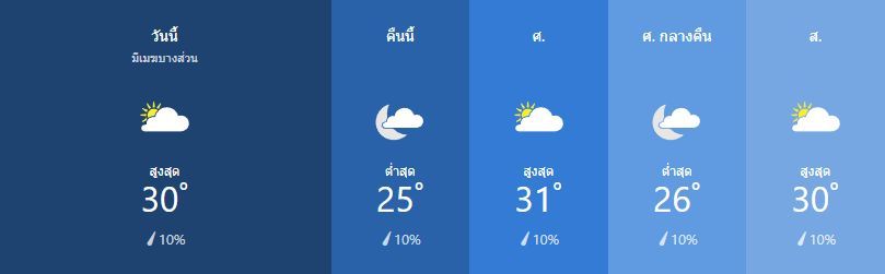 มีเมฆมากเป็นบางส่วน สูง 30เซลเซียส ความเร็วลม ตะวันออก ตะวันออกเฉียงเหนือ ที่ 15 ถึง 30 กิโลเมตรต่อชั่วโมงฃ