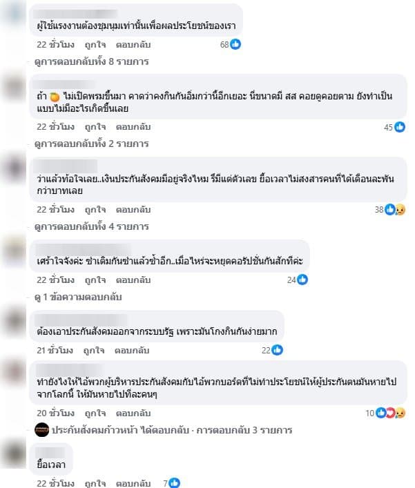 ขณะที่อีกส่วนหนึ่งออกแสดงความเห็นอย่างท้อแท้ว่า “ว่าแล้วท้อใจเลย..เงินประกันสังคมมีอยู่จริงไหม หรือมีแต่ตัวเลข ยื้อเวลาไม่สงสารคนที่ได้เดือนละพันกว่าบาทเลย” และ “เศร้าใจจังค่ะ ซ้ำเติมกันซ้ำแล้วซ้ำอีก..เมื่อไหร่จะหยุดคอรัปชันกันสักทีคะ”