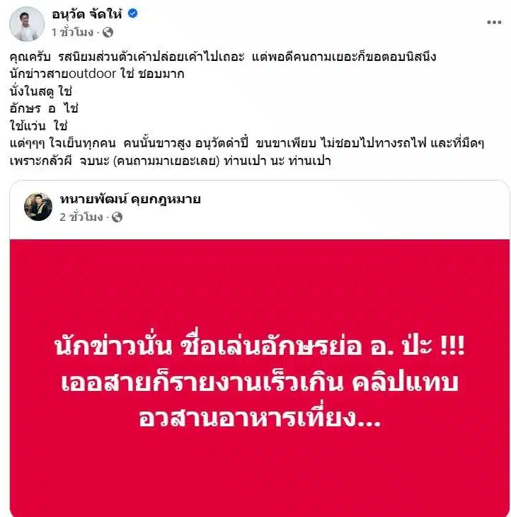 ต่อมา ทนายพัฒน์ คุยกฎหมาย ได้โพสต์ข้อความผ่านเฟซบุ๊ก บุถึงข่าวฉาวดังกล่าว พร้อมตั้งข้อสังเกตว่านักข่าวคนนั้นอาจมีชื่อเล่นขึ้นต้นด้วยอักษรย่อ “อ.”