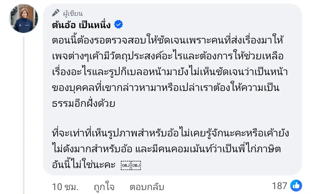 ต่อมา ต้นอ้อ เป็นหนึ่ง ได้เข้ามาแสดงความคิดเห็นใต้โพสต์ของตนเองเพื่อชี้แจงเพิ่มเติม ระบุว่าเรื่องนี้ต้องรอการตรวจสอบให้ชัดเจนก่อน เนื่องจากมีบุคคลอื่นส่งเรื่องเข้ามา ยังต้องทำความเข้าใจวัตถุประสงค์ของผู้ร้องเรียนว่าทำเพื่ออะไร