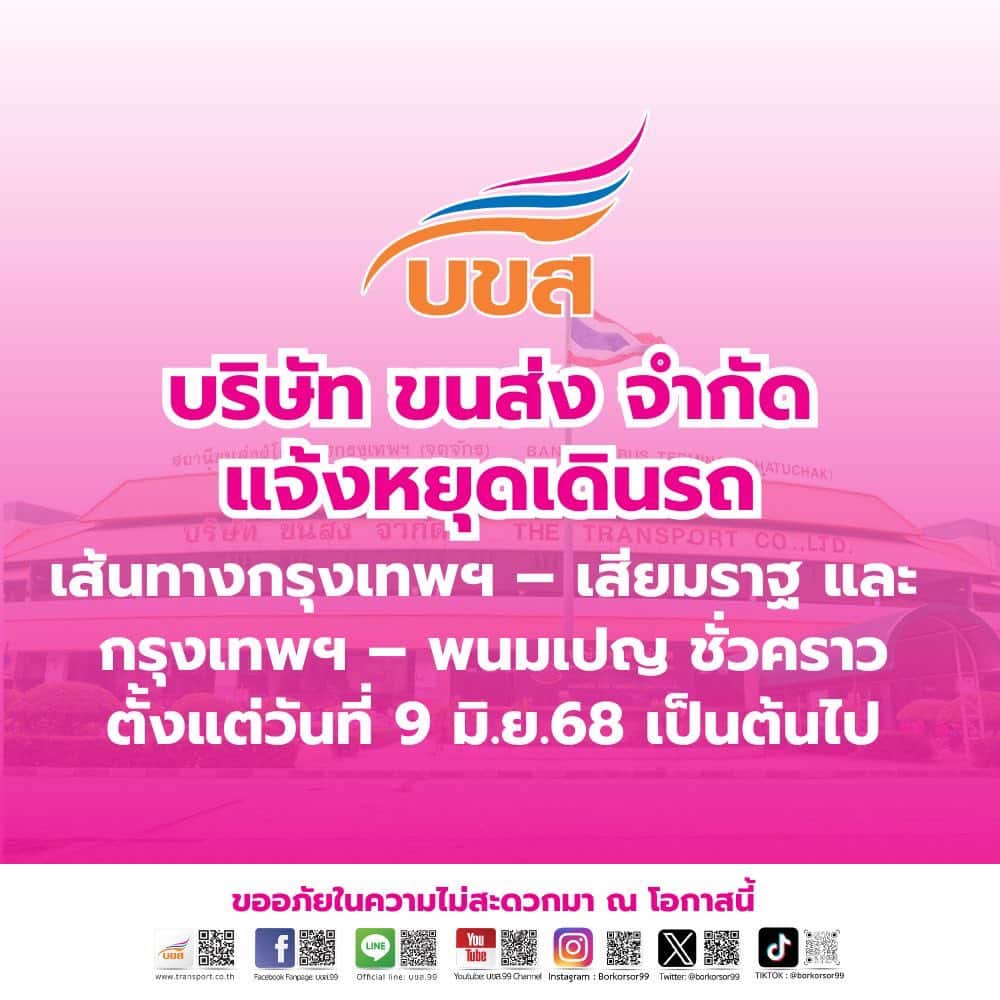เพจเฟซบุ๊กของ บขส. หรือ บริษัท ขนส่ง จำกัด ได้ออกประกาศระงับสองเส้นทาง ได้แก่ “กรุงเทพฯ – เสียมราฐ” และ “กรุงเทพฯ – พนมเปญ” โดยระบุว่า “บริษัท ขนส่ง จำกัด (บขส.) แจ้งว่า บขส. ขอหยุดการเดินรถเส้นทางระหว่างประเทศไทย – กัมพูชา จำนวน 2 เส้นทาง คือ เส้นทางที่ 12 กรุงเทพฯ – เสียมราฐ และ เส้นทางที่ 13 กรุงเทพฯ – พนมเปญ เป็นการชั่วคราว ตั้งแต่วันที่ 9 มิถุนายน 2568 เป็นต้นไป เนื่องจากมีการห้ามรถโดยสารข้ามจุดผ่านแดนฯ ระหว่างประเทศไทย และกัมพูชา ชั่วคราว ทั้งนี้ บขส. ขออภัยในความไม่สะดวก และหากมีความคืบหน้าจะแจ้งให้ทราบต่อไป