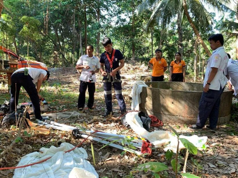 จากการตรวจสอบพบว่า เป็นบ่อน้ำบาดาล รกร้างกลางสวนยางพารา มีความลึกประมาณ 8 – 10 เมตร ต้องโรยตัวลงไปช่วยเหลือ จึงได้ประสานงานไปยังเจ้าหน้าที่ศูนย์ป้องกันและบรรเทาสาธารณภัย เขต 18 เพื่อขอสนับสนุนอุปกรณ์โรยตัว จากนั้นหน่วยกู้ภัยฯและเจ้าหน้าที่ ปภ.ร่วมตรวจเช็คอุปกรณ์ต่างๆ เพื่อป้องกันอันตราย ก่อนโรยตัวลงไปภายในบ่อที่แคบ เบื้องต้นพบเป็นสุนัขเพศเมีย สีน้ำตาล อายุประมาณ 2 – 3 ปี ลอยคออยู่ในน้ำ และอยู่ในอาการตื่นตกใจ