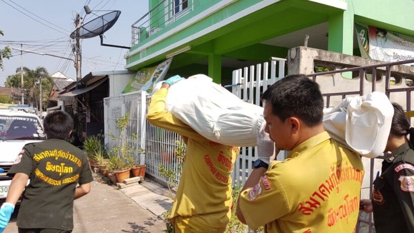 ตาผูกคอตาย – เวลา 09.00 น. วันที่ 21 ก.พ. ตำรวจ สภ.เมืองพิษณุโลก รับแจ้งพบศพผู้เสียชีวิต 2 ราย ภายในบ้านพักเลขที่ 11 หมู่ 2 ต.วัดจันทร์ อ.เมือง จ.พิษณุโลก บริเวณลูกกรงเหล็กรั้วบันไดหน้าบ้านพบศพชาย 1 ราย คือ นายจรูญ ศิริวัฒน์ อายุ 89 ปี ใช้สายไฟผูกคอตัวเองกับเหล็กราวบันได คาดว่าเสียชีวิตมาแล้วไม่ต่ำกว่า 3 ช.ม. ที่ห้องครัวพบศพผู้หญิง คือ นางบุญมา ศิริวัฒน์ อายุ 82 ปี ภรรยาของนายจรูญ นอนคว่ำหน้าจมกองเลือดอยู่ข้างซิงค์ล้างจาน หลังศีรษะมีบาดแผลฉีกขาดยาวประมาณ 5 ซม. ใกล้กันพบเหล็กข้ออ้อยยาว 70 ซม.