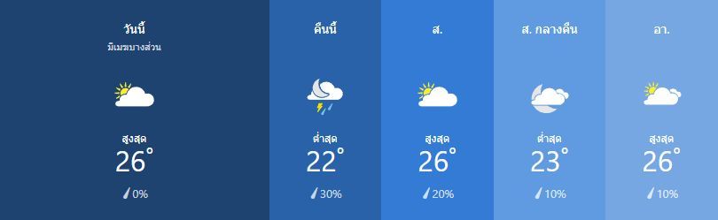 มีเมฆมากเป็นบางส่วน สูง 26เซลเซียส ความเร็วลม ตะวันออกเฉียงใต้ ที่ 15 ถึง 25 กิโลเมตรต่อชั่วโมง
