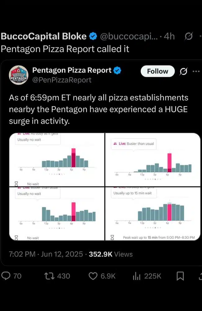 บัญชียอดนิยม ‘Pentagon Pizza Report’ ซึ่งอ้างว่าให้ข้อมูลลับสุดร้อนแรง ได้บันทึกการเพิ่มขึ้นอย่างน่าทึ่งของการจราจรที่ร้านพิซซ่าในท้องถิ่น โดยระบุว่าร้านพิซซ่าหลายแห่งใกล้เพนตากอนมียอดสั่งซื้อพุ่งสูงขึ้นอย่างมากในเวลาประมาณ 18:59 น. ตามเวลาท้องถิ่น ซึ่งเป็นเวลาประมาณหนึ่งชั่วโมงก่อนที่สถานีโทรทัศน์ของรัฐอิหร่านจะรายงานการระเบิดในกรุงเตหะราน