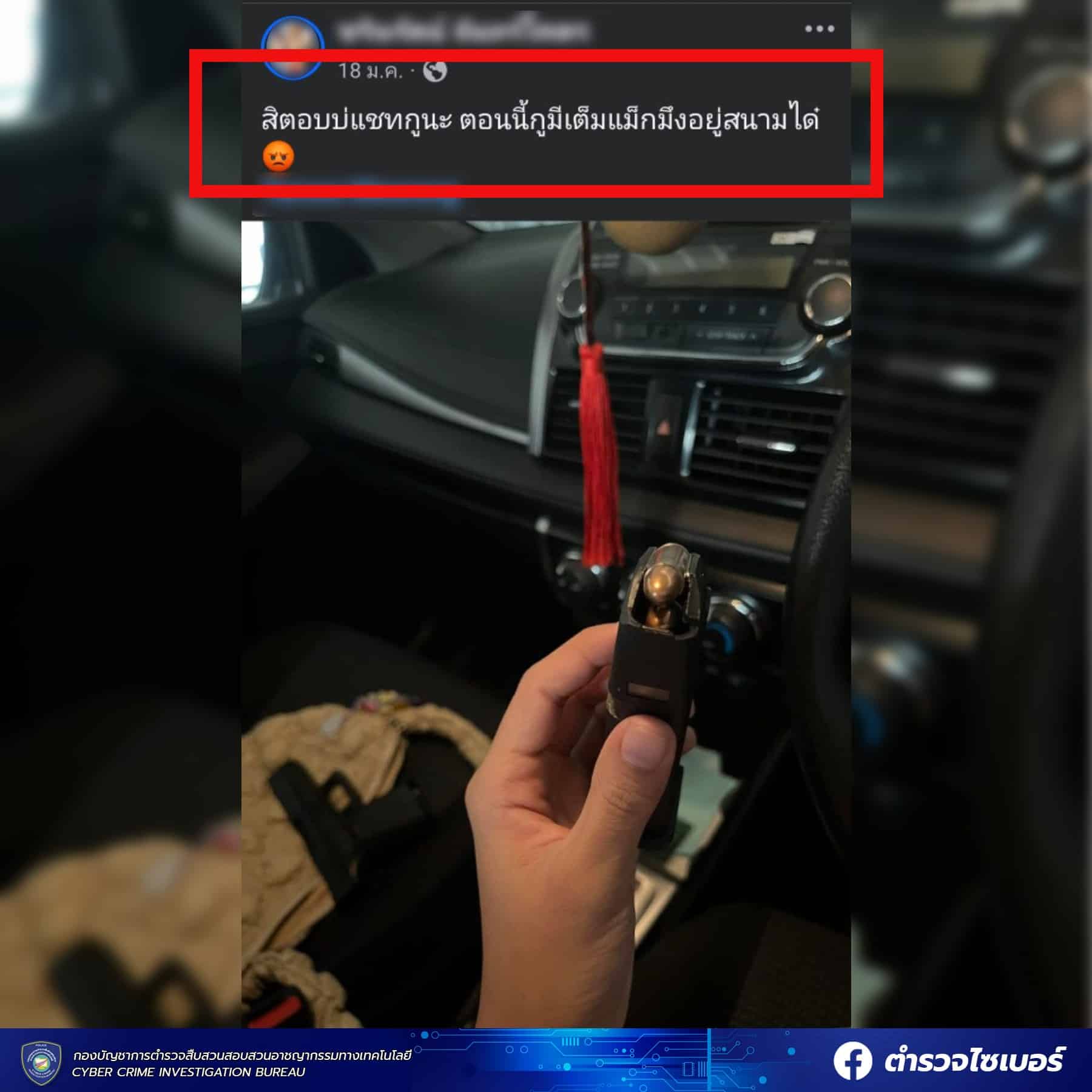 ตำรวจได้รับเบาะแสจากประชาชนผ่านเพจ “ตำรวจไซเบอร์ – บช.สอท.” ว่ามีบัญชีเฟซบุ๊กของหญิงสาวรายหนึ่งชอบโพสต์ภาพอาวุธปืนลงในฟีดและสตอรี่หลายครั้ง เจ้าหน้าที่จึงตรวจสอบ พบว่าเป็นหญิงสาวอายุ 19 ปี มีพฤติกรรมตามที่ได้รับแจ้งจริง