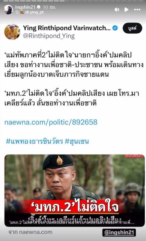 - แม่ทัพภาค 2 คุยกับนายกอิ๊งค์แล้ว บอกไม่มีอะไร ตนเข้าใจ ไม่ติดใจ