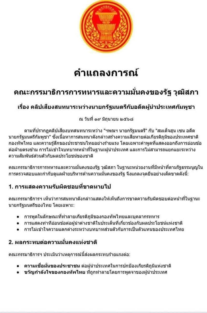 กมธ.การทหาร จะยื่นเรื่องต่อองค์กรอิสระที่เกี่ยวข้องทุกองค์กร อาทิ คณะกรรมการป้องกันและปราบปรามการทุจริตแห่งชาติ(ป.ป.ช.) ศาลรัฐธรรมนูญ ให้ถอดถอน น.ส.แพทองธาร ออกจากตำแหน่งนายกรัฐมนตรี เนื่องจากกรณีคลิปเสียง เข้าข่ายกระทำผิดรัฐธรรมนูญหลายมาตรา เช่น มาตรา 1 ประเทศไทยเป็นราชอาณาจักรอันหนึ่งอันเดียว จะแบ่งแยกมิได้ มาตรา 160(4) (5) ขาดคุณสมบัติในการดำรงตำแหน่งทางการเมือง