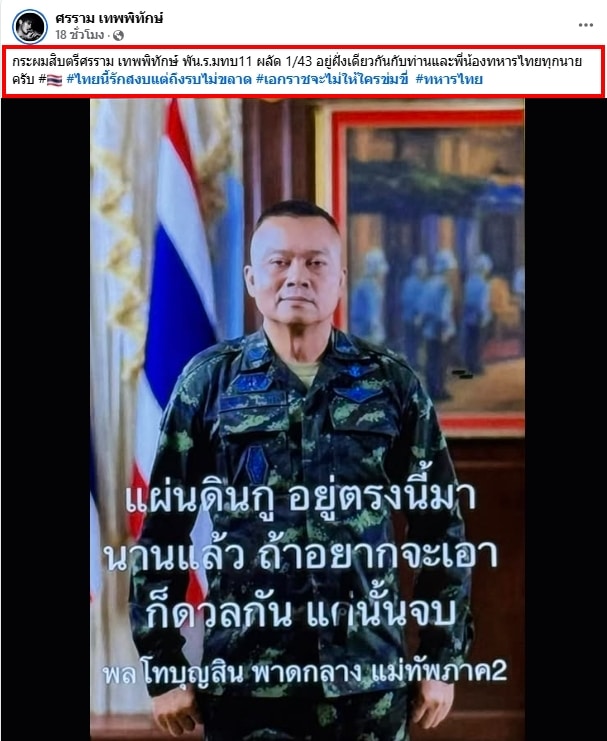 ไม่เว้นแม้กระทั่ง หนุ่ม ศรราม เทพพิทักษ์ ได้โพสต์ภาพของ “บิ๊กกุ้ง” แม่ทัพภาค 2 ผ่านทางเฟซบุ๊กส่วนตัว พร้อมแคปชั่นที่แสดงถึงจุดยืนอันหนักแน่นว่า “กระผมสิบตรีศรราม เทพพิทักษ์ พัน.ร.มทบ11 ผลัด 1/43 อยู่ฝั่งเดียวกันกับท่านและพี่น้องทหารไทยทุกนายครับ #ไทยนี้รักสงบแต่ถึงรบไม่ขลาด #เอกราชจะไม่ให้ใครข่มขี่ #ทหารไทย”