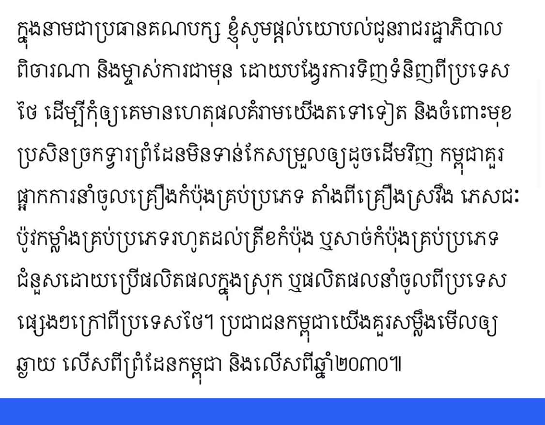 ในฐานะผู้นำพรรค ข้าพเจ้าขอแนะนำให้รัฐบาลกัมพูชาและผู้ประกอบการ พิจารณาหันเหการซื้อสินค้าจากประเทศไทย เพื่อไม่ให้ฝ่ายไทยมีเหตุผลมาใช้ข่มขู่อีกต่อไป และหากปัญหาด่านชายแดนยังไม่ได้รับการแก้ไข กัมพูชาควรระงับการนำเข้าสินค้ากระป๋องทุกชนิดจากประเทศไทย ทั้งเครื่องดื่มแอลกอฮอล์ เครื่องดื่มให้พลังงาน ปลากระป๋อง หรือเนื้อสัตว์กระป๋อง และหันมาใช้สินค้าผลิตในประเทศหรือสินค้าที่นำเข้าจากประเทศอื่นแทน