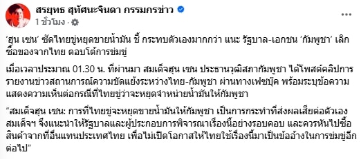 ยังคงต้องติดตามความคืบหน้ากันต่อสำหรับข้อพิพาทที่ดูท่าว่าจะเริ่มบานปลายขึ้นเรื่อย ๆ ระหว่าง รัฐบาลไทย กับ สมเด็จ ฮุนเซน ล่าสุดช่วงกลางดึกที่ผ่านมา เวลาประมาณ 22.30 น. เพจเฟซบุ๊ก สรยุทธ สุทัศนะจินดา กรรมกรข่าว ได้แชร์โพสต์จากเพจเฟวบุ๊กของ ฮุนเซน ที่มีความเคลื่อนไหวเกิดขึ้น โดย
