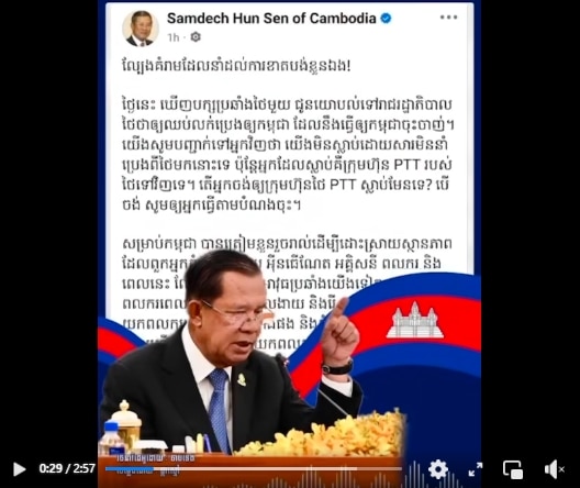ต่อมาในเวลา 01.30 น. หน้าเพจเฟซบุ๊กของ ฮุนเซน ก็มีความเคลื่อนไหวอีกครั้ง โดยรอบนี้เป็นการโพสต์คลิปรายงานข่าวสถานการณ์ความขัดแย้งระหว่างไทย-กัมพูชา ความยาวเกือบ 3 นาที พร้อมระบุข้อความแสดงความคิดเห็นต่อกรณีที่ไทยขู่จะยกเลิกขายน้ำมันให้กัมพูชา ว่า