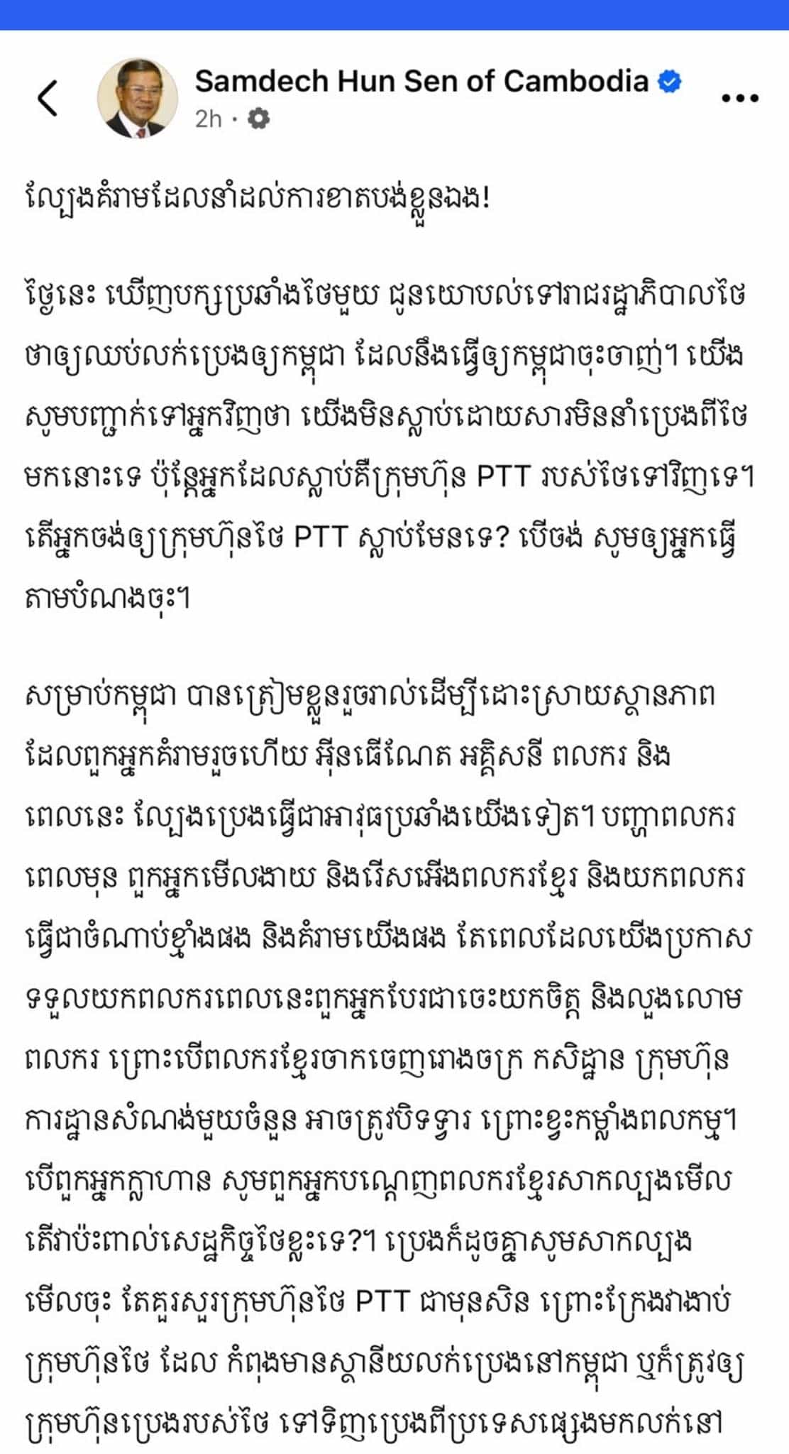 ในการนี้ เราขอยืนยันอย่างชัดเจนว่า กัมพูชาจะไม่ล้มเหลวเพียงเพราะไม่ได้ซื้อน้ำมันจากประเทศไทย ในทางกลับกัน อาจเป็นบริษัท PTT ของไทยเองที่ต้องเผชิญกับผลกระทบ คุณต้องการให้บริษัท PTT ของไทยล่มสลายใช่หรือไม่? ถ้าคุณต้องการเช่นนั้น ก็จงเดินหน้าต่อไปตามแผนของคุณ
