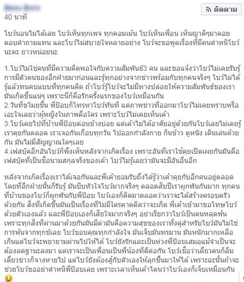 และล่าสุดวันนี้ (24 ก.พ.) โบว์ หนึ่งในแฟนสาวที่ถูกคบซ้อนได้ออกมาโพสต์ข้อความในเฟซบุ๊กส่วนตัวว่า