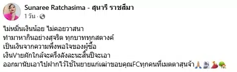 ลูกทุ่งดังเผยสาเหตุที่ออกมาเป็นแม่ค้าขายผักแบบนี้ เพราะ “ไม่หมิ่นเงินน้อย ไม่คอยวาสนา ทำมาหากินอย่างสุจริต ทุกบาททุกสตางค์ เป็นเงินจากความพึ่งพอใจของผู้ซื้อ เงินขายผักใกล้จะครึงลังละนะสิ้นปีจะเอา ออกมานับเอาไปฝากไว้ใช้ในยายแก่เฒ่า ขอบคุณFCทุกคนที่เมตตาสุจ้า”