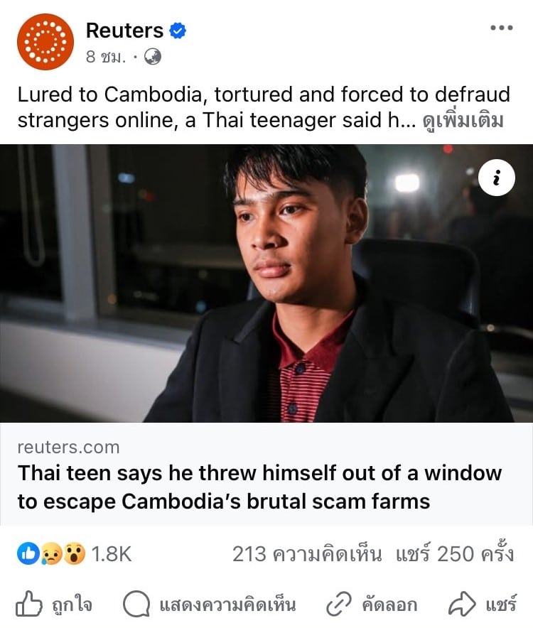 “ในช่วงหลายวันที่ผ่านมา สำนักข่าวรอยเตอร์ (Reuters) ที่เป็นสื่อยักษ์ใหญ่จากต่างประเทศเริ่มเกาะกระแสความขัดแย้งระหว่างไทยและกัมพูชามากขึ้นเรื่อยๆ และเรื่องขบวนการสแกมเมอร์ของกัมพูชาก็มักถือหยิบยกขึ้นมาพูดบ่อยๆในเนื้อหาข่าวของรอยเตอร์เช่นกัน”