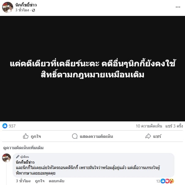 แค่คดีเดียวที่เคลียร์นะคะ คดีอื่น ๆ นิกกี้ยังคงใช้สิทธิ์ตามกฎหมายเหมือนเดิม และนิกกี้ไม่เคยเอ่ยให้ใครถอนคดีนิกกี้ เพราะมั่นใจว่าพร้อมสู้อยู่แล้ว แต่เมื่อวานเกรงใจผู้พิพากษาเลยยอมพูดคุย”