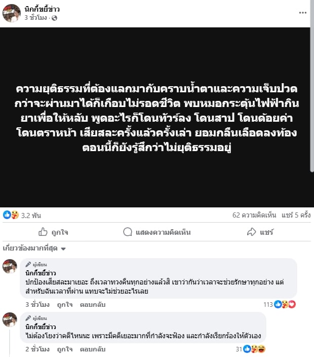 ต่อมาทาง นิกกี้ขยี้ข่าว ก็ได้มีความเคลื่อนไหวผ่านหน้าเพจเฟซบุ๊กของตัวเองเช่นกัน เผยว่า “ความยุติธรรมที่ต้องแลกมากับคราบน้ำตาและความเจ็บปวด กว่าจะผ่านมาได้ก็เกือบไม่รอดชีวิต พบหมอกระตุ้นไฟฟ้ากินยาเพื่อให้หลับ พูดอะไรก็โดนทัวร์ลง โดนสาป โดนด้อยค่า โดนตราหน้า เสียสละครั้งแล้วครั้งเล่า ยอมกลืนเลือดลงท้อง ตอนนี้ก็ยังรู้สึกว่าไม่ยุติธรรมอยู่