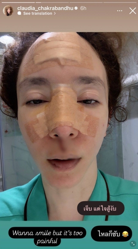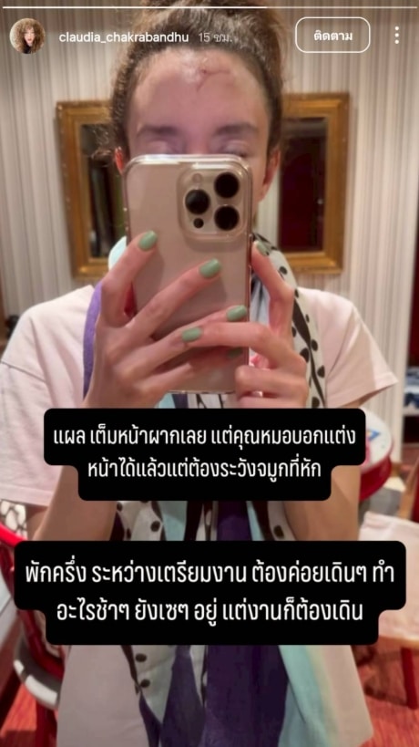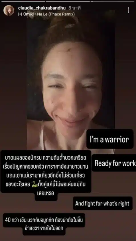 ล่าสุด คลาวเดีย ได้ออกมาชี้แจงถึงสาเหตุเบื้องต้นที่ทำให้เธอเกิดอาการวูบหมดสติกะทันหัน หวิดเสียโฉม โดยเจ้าตัวได้โพสต์ภาพใบหน้าของตัวเองที่ดีขึ้นตามลำดับ เหลือเพียงรอยแผลเป็นที่ต้องรับการดุแลรักษาอีกครั้ง พร้อมพิมพ์ข้อความประกอบว่า “บาดแผลของนักรบ ความดันต่ำบวกเครียดเรื่องปัญหาครอบครัว คาราคาซังมายาวนาน แถมเอาแม่เรามาเกี่ยวอีก ซึ่งไม่มีส่วนเกี่ยวข้องอะไรเลย แค่นี้ไม่พอเล่นแม่กันเลยหรอ 40 กว่าเข็มบวกกับจมูกหัก ต้องผ่าตัดไม่งั้นข้างขวาหายใจไม่ออก I’m a warrior. Ready for work and fight for what’s right.”