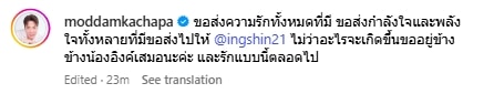 “ขอส่งความรักทั้งหมดที่มี ขอส่งกำลังใจและพลังใจทั้งหลายที่มีขอส่งไปให้ @ingshin21 ไม่ว่าอะไรจะเกิดขึ้นขออยู่ข้างข้างน้องอิงค์เสมอนะค่ะ และรักแบบนี้ตลอดไป”