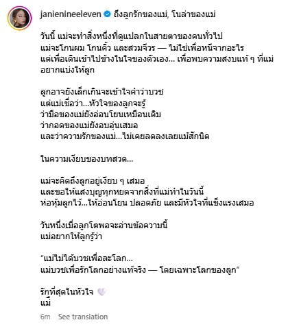 วันหนึ่งเมื่อลูกโตพอจะอ่านข้อความนี้ แม่อยากให้ลูกรู้ว่า “แม่ไม่ได้บวชเพื่อละโลก…แม่บวชเพื่อรักโลกอย่างแท้จริง — โดยเฉพาะโลกของลูก” รักที่สุดในหัวใจ แม่