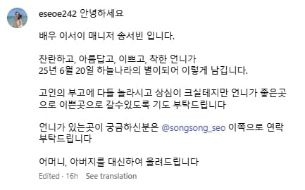 “สวัสดีค่ะ ดิฉัน ซงซอบิน ผู้จัดการของนักแสดง อีซอยี ค่ะ พี่สาวผู้เปล่งประกาย งดงาม น่ารัก และแสนดีของเรา ได้กลายเป็นดวงดาวบนฟากฟ้า เมื่อวันที่ 20 มิถุนายน ปี 2025 จึงขอแจ้งข่าวเศร้าให้ทุกท่านได้รับทราบ แต่ขอให้ช่วยภาวนาให้พี่สาวของเรา ได้เดินทางไปยังสถานที่ที่สวยงามและสงบสุขด้วยนะคะ หากท่านใดต้องการทราบข้อมูลเพิ่มเติม สามารถติดต่อได้ทาง @songsong_seo ขอแจ้งให้ทราบในนามของคุณพ่อและคุณแม่ของเธอค่ะ”