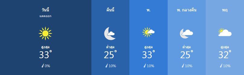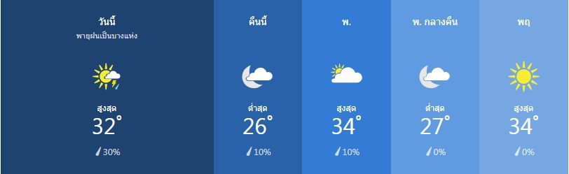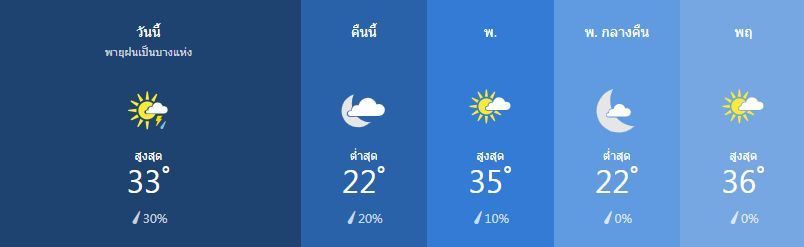 มีเมฆมากเป็นบางส่วน มีโอกาสเกิดพายุฟ้าคะนอง สูง 33เซลเซียส ความเร็วลม ตะวันออก ตะวันออกเฉียงใต้ ที่ 10 ถึง 15 กิโลเมตรต่อชั่วโมง โอกาสที่ฝนจะตก 30%