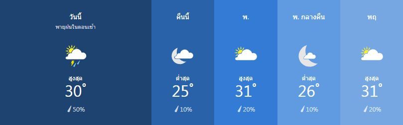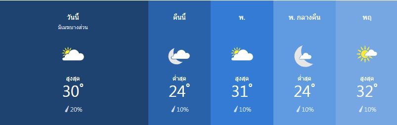 มีเมฆมากเป็นบางส่วน สูง 30เซลเซียส ความเร็วลม ตะวันออกเฉียงใต้ ที่ 15 ถึง 25 กิโลเมตรต่อชั่วโมง