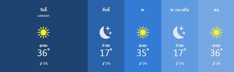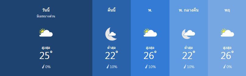 มีเมฆมากเป็นบางส่วน สูง 25เซลเซียส ความเร็วลม ตะวันออก ตะวันออกเฉียงใต้ ที่ 15 ถึง 30 กิโลเมตรต่อชั่วโมง
