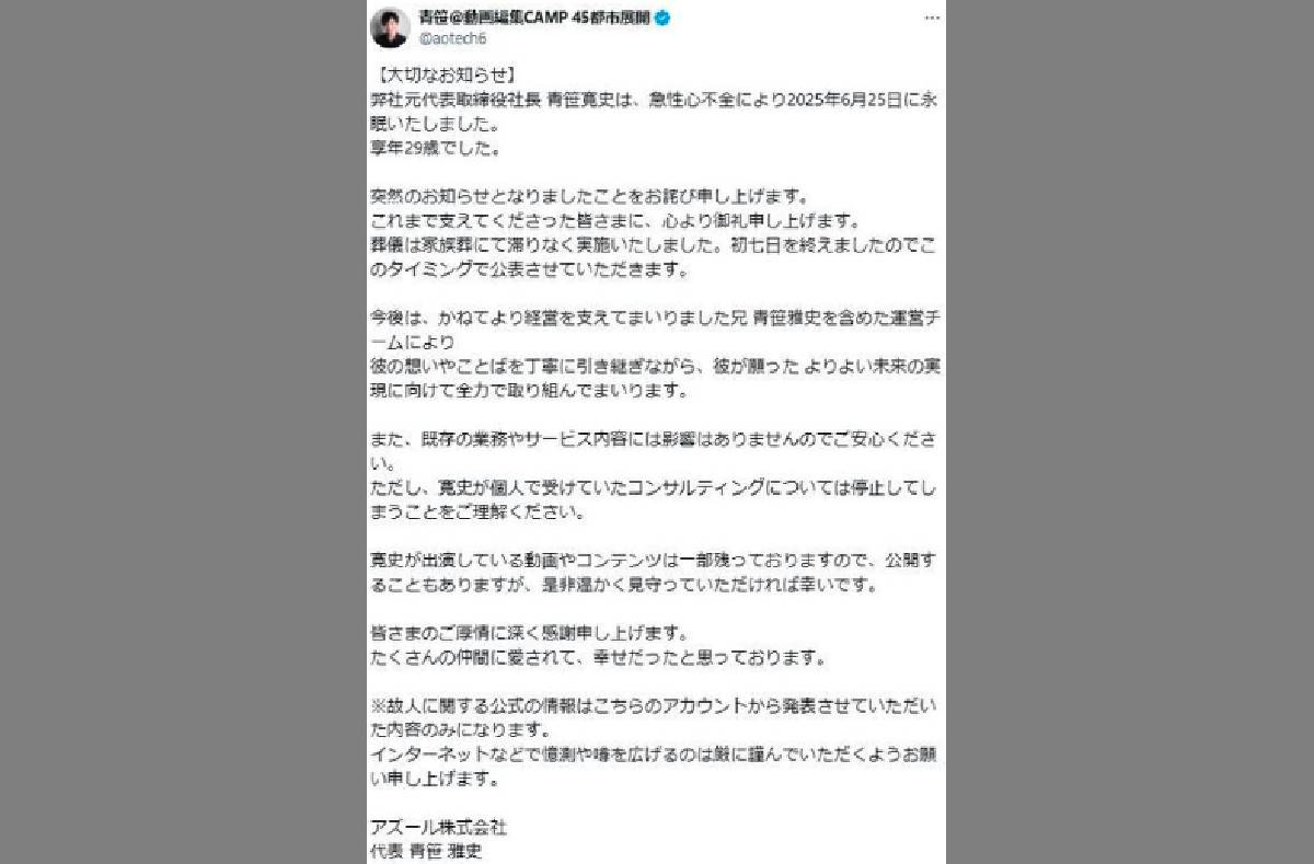 “ถึงผู้เกี่ยวข้องทุกท่าน, นายอาโอซาสะ ฮิโรชิ อดีตประธานกรรมการบริหารบริษัทของเรา ได้ถึงแก่กรรมอย่างสงบเมื่อวันที่ 25 มิถุนายน 2025 ที่ผ่านมา ด้วยภาวะหัวใจล้มเหลวเฉียบพลัน อายุรวม 29 ปี โดยพิธีศพได้จัดขึ้นเป็นการภายในเฉพาะครอบครัวและดำเนินไปอย่างเรียบร้อยแล้ว”