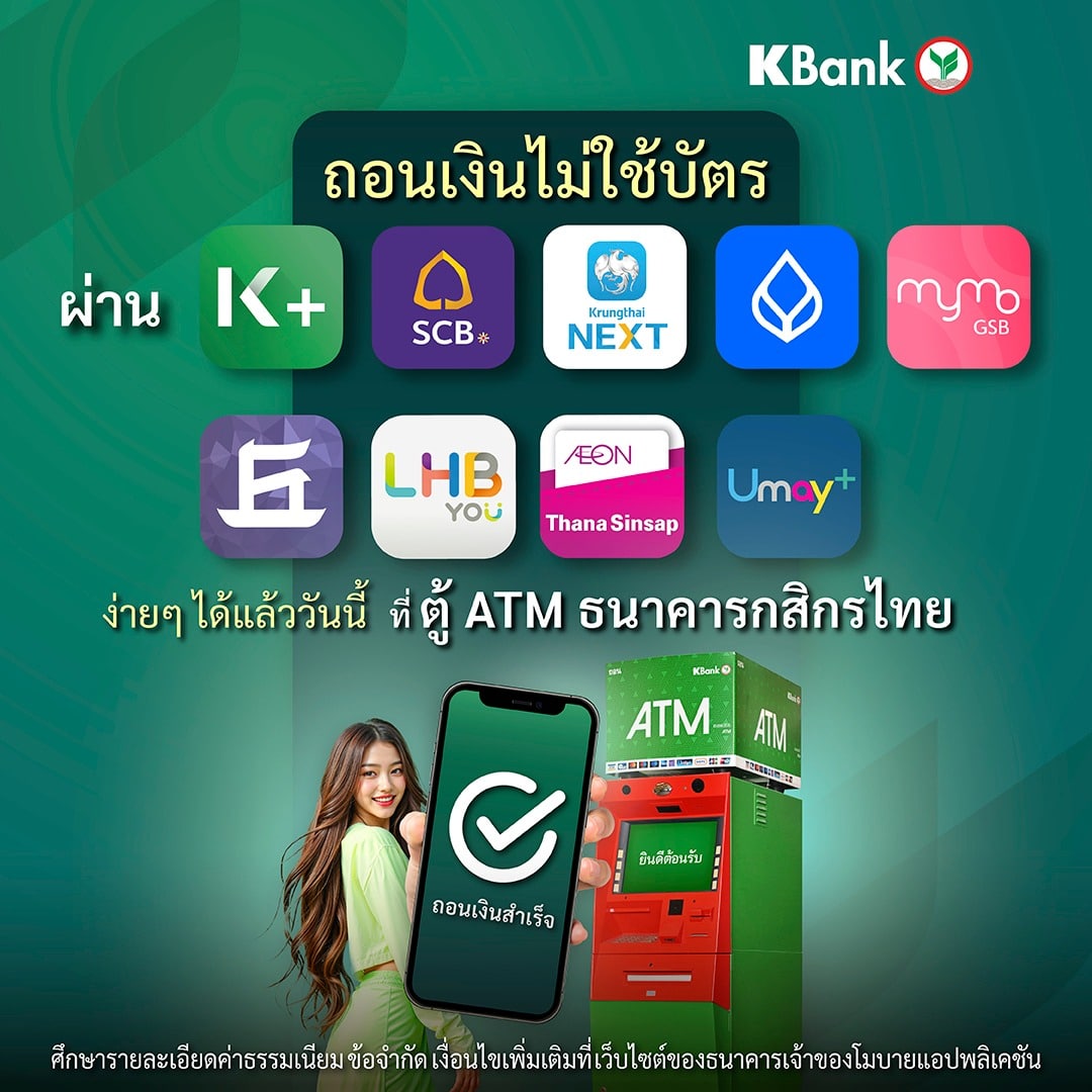 ถอนเงินไม่ใช้บัตร ผ่านตู้ ATM ธนาคารกสิกรไทย ฟรี ไม่มีค่าธรรมเนียม สบายใจได้ กดเท่าไหร่ก็ไม่โดนหัก แค่ตั้งรายการผ่านแอป K PLUS แล้วไปรับเงินที่ตู้ ATM กสิกรไทยทั่วประเทศได้เลย