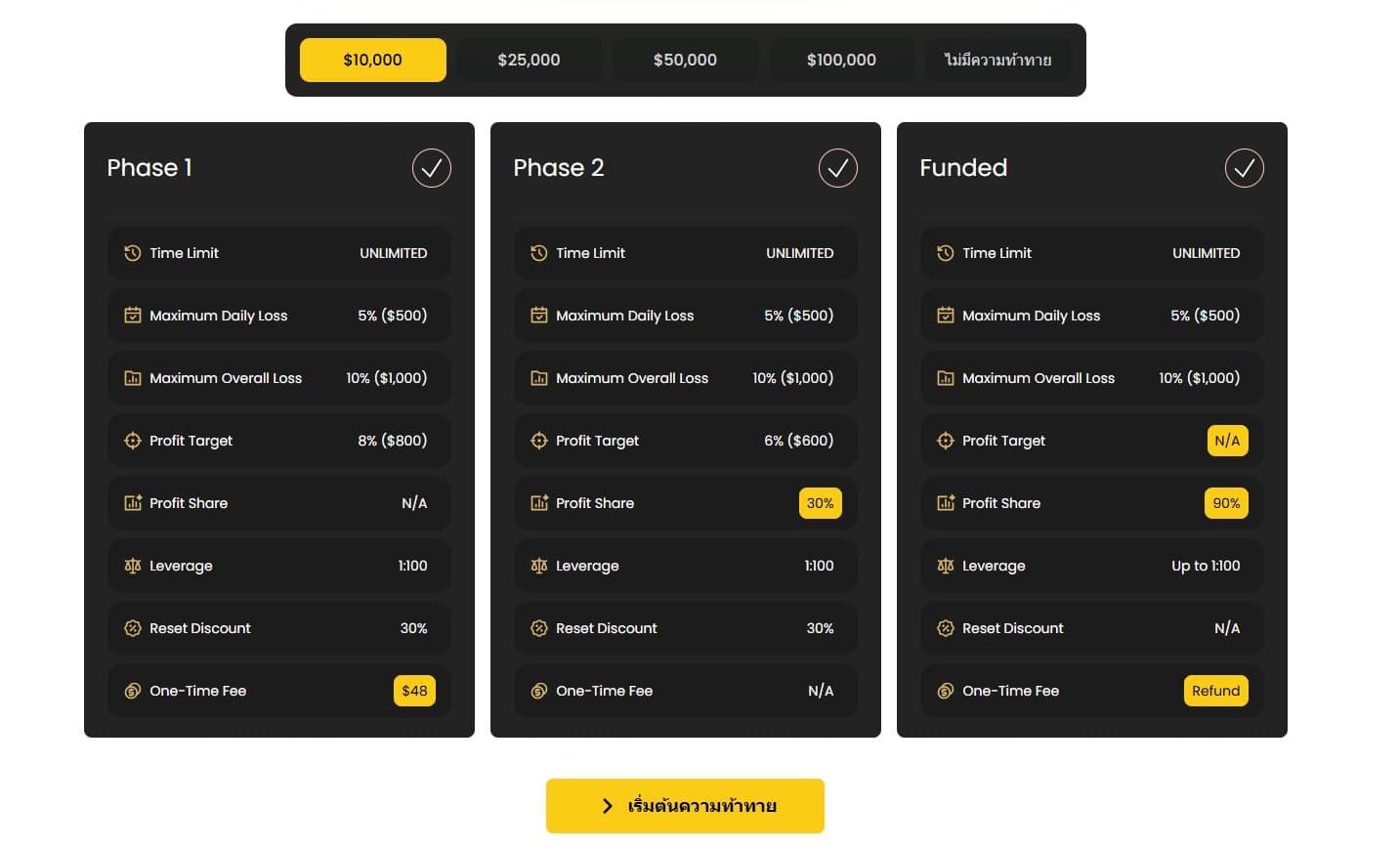 บัญชีมีหลายระดับให้เลือก โดยค่าธรรมเนียมในการเข้าร่วมจะถูกกำหนดตามขนาดบัญชีที่เลือก จุดเด่นคือไม่มีการจำกัดระยะเวลาในการทำ Challenge ช่วยลดความกดดัน และเปิดโอกาสให้ผู้ใช้สามารถวางแผนการเทรดให้สอดคล้องกับสไตล์ของตนเอง นอกจากนี้ยังมีระบบให้ลงทะเบียนใหม่ด้วยค่าธรรมเนียมที่เป็นมิตร หากต้องการเริ่มทดสอบอีกครั้ง