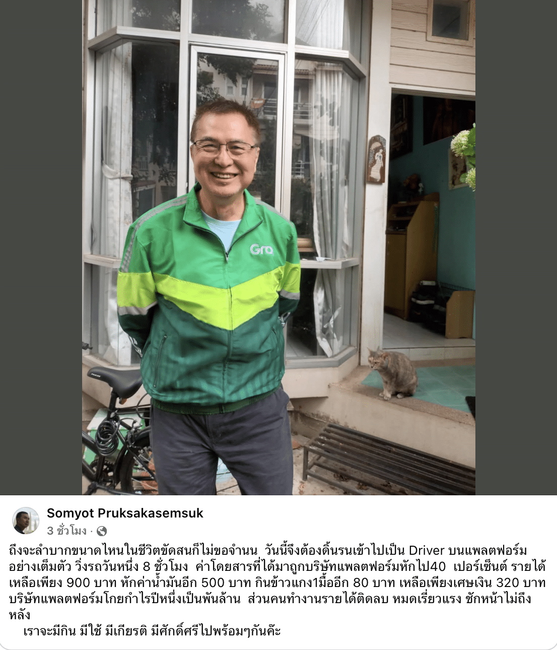 ในโพสต์ดังกล่าว นายสมยศได้เปิดเผยรายละเอียดการทำงานในหนึ่งวันอย่างตรงไปตรงมา ระบุว่า ทำงานทั้งหมด 8 ชั่วโมง มีรายได้รวม 900 บาท ถูกหักค่าส่วนแบ่ง (GP) ให้กับบริษัทแพลตฟอร์ม 40% มีค่าใช้จ่ายส่วนตัวเป็นค่าน้ำมัน 500 บาท และค่าอาหาร (ข้าวแกง) 80 บาท หลังจากหักค่าใช้จ่ายทั้งหมดแล้ว คงเหลือเงินสุทธิเพียง 320 บาท