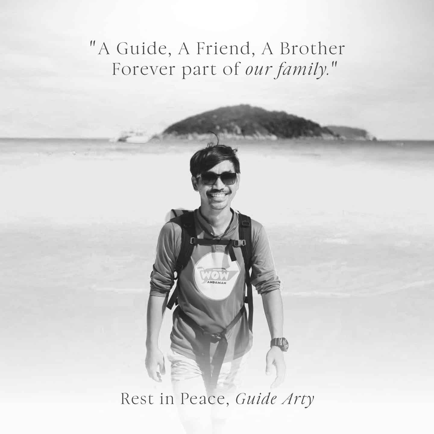 “Wow Andaman ขอแสดงความเสียใจและอาลัยอย่างสุดซึ้งต่อการจากไปของ ‘ไกด์อาร์ตี้’ หรือ ‘พี่อาร์ต’ ผู้เป็นที่รักยิ่งของพวกเราทุกคน”