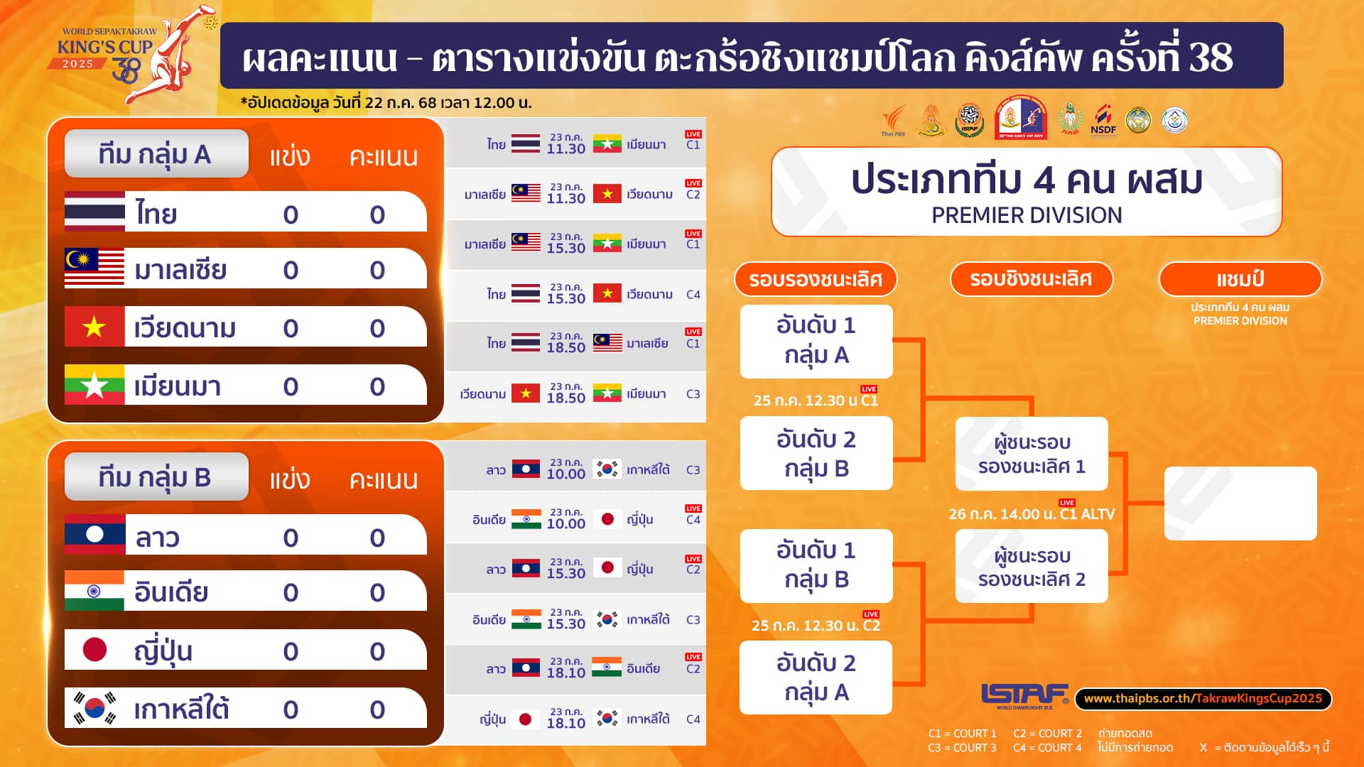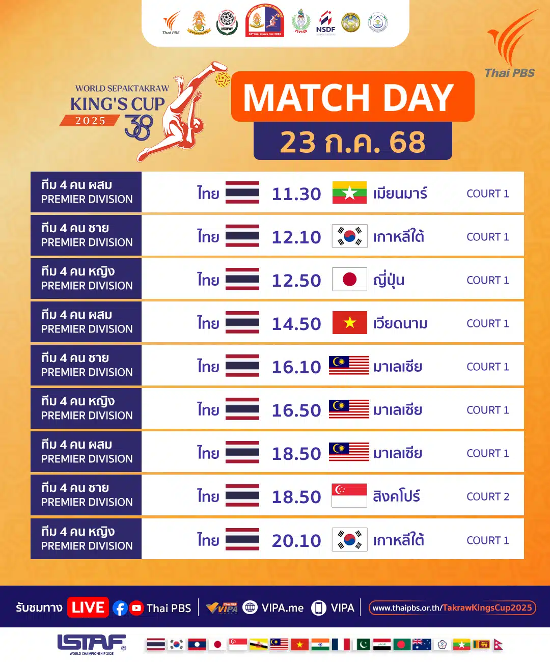 ตารางแข่งขัน ถ่ายทอดสด ศึกเซปักตะกร้อชิงแชมป์โลก “คิงส์คัพ“ ครั้งที่ 38 ที่จ.สงขลา วันนี้ 23 ก.ค. 68 พร้อมช่องทางดูออนไลน์