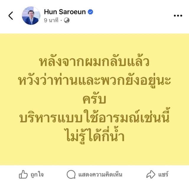 ล่าสุด ฮุน ซาเรือน เอกอัครราชทูตกัมพูชาประจำประเทศไทย โพสต์ข้อความเฟซบุ๊กระบุว่า “หลังจากผมกลับแล้ว หวังว่าท่านและพวกยังอยู่นะครับ บริหารแบบใช้อารมณ์เช่นนี้ ไม่รู้ได้กี่น้ำ”