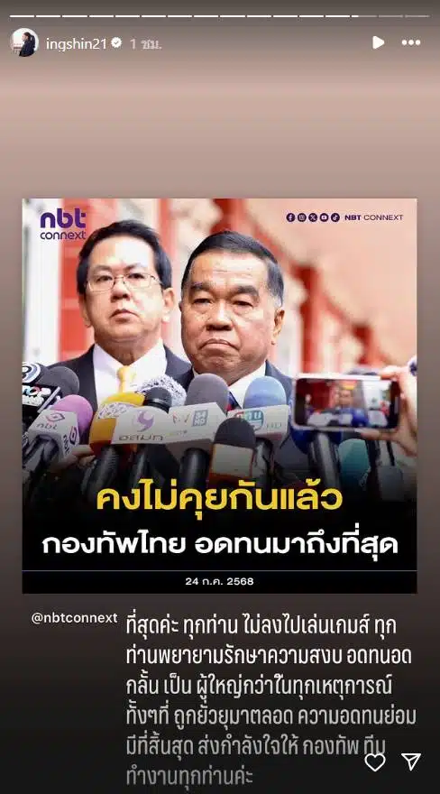 น.ส.แพทองธาร ชินวัตร นายกรัฐมนตรีและรัฐมนตรีกระทรวงวัฒนธรรม โพสต์ข้อความลงในอินสตาแกรม (IG) สตอรี่ ถึงสถานการณ์ทหารไทยและทหารกัมพูชาปะทะกัน ตั้งแต่ช่วงเวลา 8.00 น. ที่ผ่านมานั้น