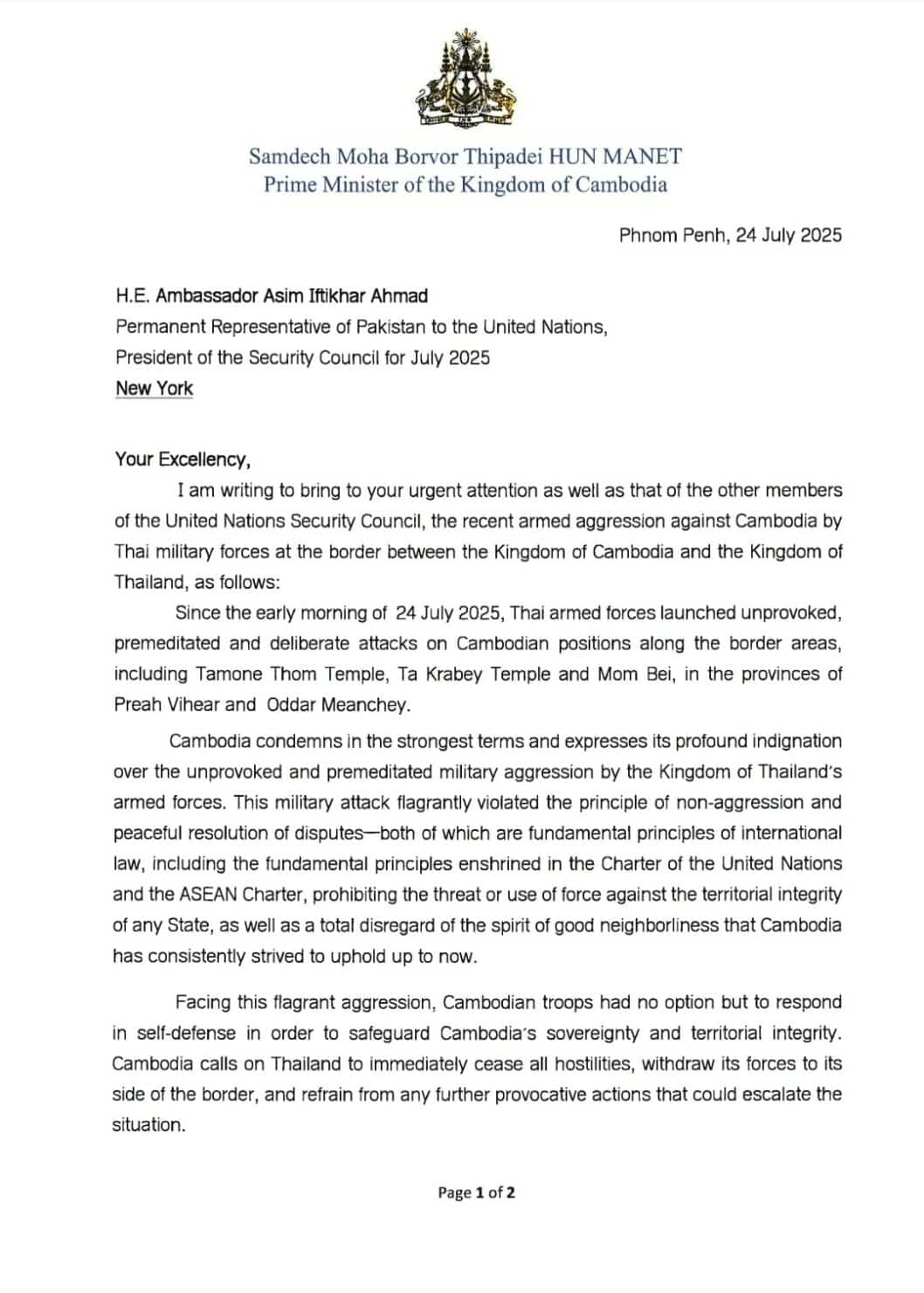 วันที่ 24 กรกฎาคม 2568 – ปวิน ชัชวาลพงศ์พันธ์ ศาสตราจารย์ ประจำสถาบันเอเชียตะวันออกเฉียงใต้ศึกษา มหาวิทยาลัยเกียวโต ได้โพสต์ข้อความผ่านเฟซบุ๊กส่วนตัว อธิบายถึงขั้นตอนและกระบวนการของสหประชาชาติ (UN) หลังจากมีรายงานว่าประเทศกัมพูชาได้ยื่นจดหมายอย่างเป็นทางการถึงคณะมนตรีความมั่นคงแห่งสหประชาชาติ (UNSC) การเคลื่อนไหวนี้ถือเป็นการเริ่มต้นกระบวนการทางการทูตระหว่างประเทศเพื่อจัดการกับสิ่งที่กัมพูชามองว่าเป็น “ภัยคุกคามต่อสันติภาพ”