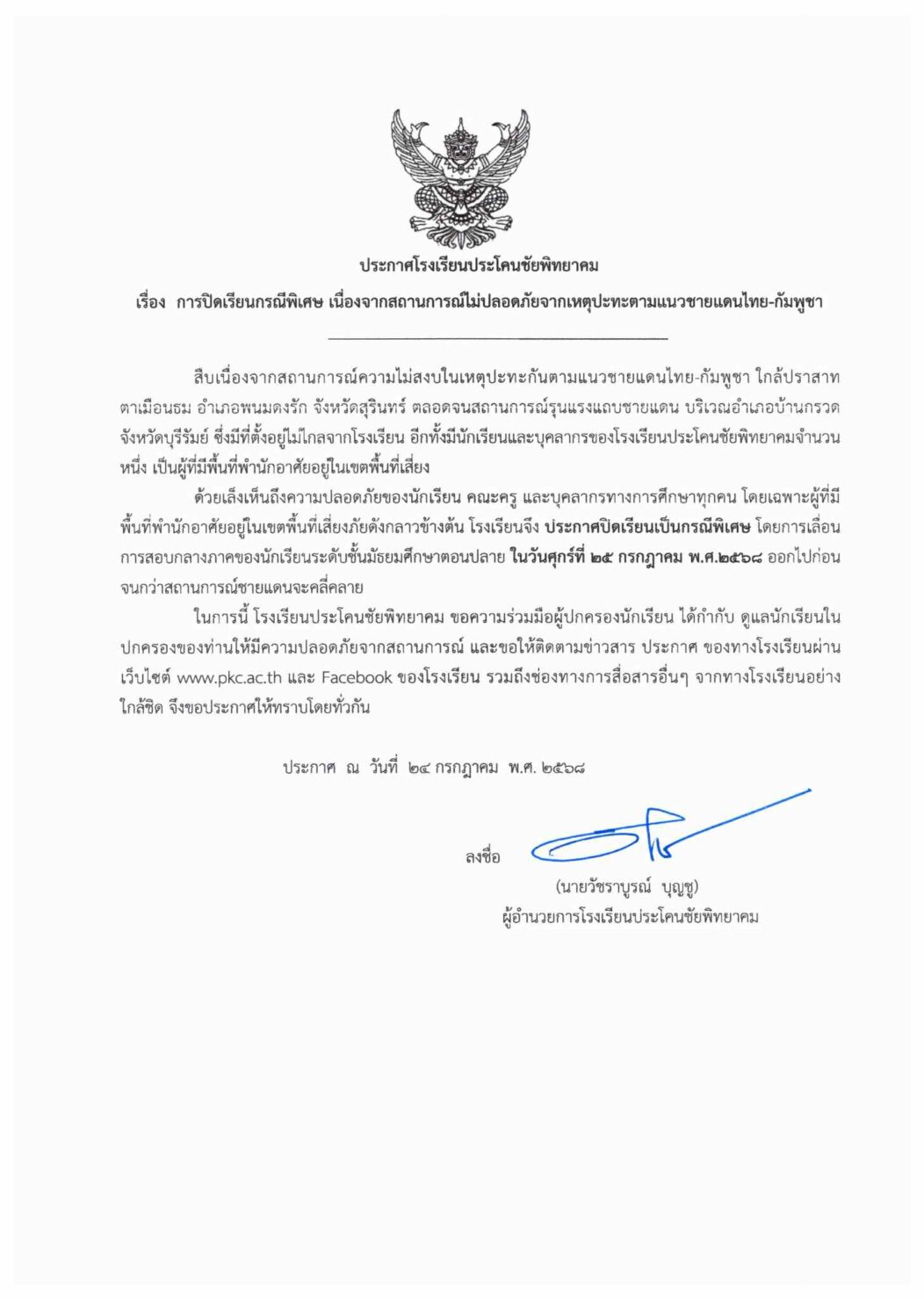 ประกาศลงนามโดย นายวัชราบูรณ์ บุญชู ผู้อำนวยการโรงเรียนประโคนชัยพิทยาคม เมื่อวันที่ 24 กรกฎาคม 2568 ระบุถึงสาเหตุการปิดว่า สืบเนื่องจากสถานการณ์ความไม่สงบและเหตุปะทะรุนแรงตามแนวชายแดนไทย-กัมพูชา บริเวณช่องจอม อำเภอกาบเชิง และปราสาทตาเมือนธม อำเภอพนมดงรัก จังหวัดสุรินทร์ ซึ่งอยู่ไม่ไกลจากพื้นที่อำเภอประโคนชัย