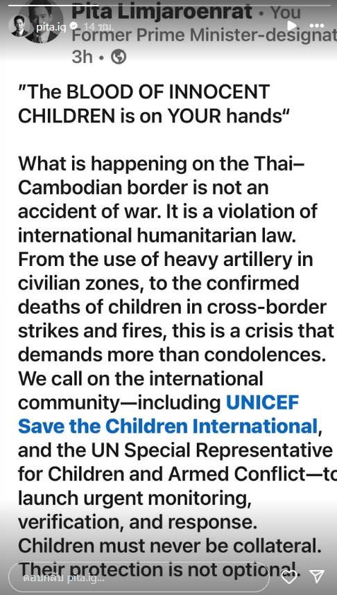 โดยนายพิธา ระบุว่า “เลือดของเด็กผู้บริสุทธิ์อยู่ในมือของคุณ สิ่งที่เกิดขึ้นในชายแดนไทย-กัมพูชา ไม่ใช่อุบัติเหตุทางสงคราม แต่เป็นการละเมิดกฎสิทธิมนุษยชนนานาชาติ จากการใช้อาวุธหนักในพื้นที่ประชาชน จนไปถึงการเสียชีวิตของเด็กในการโจมตีข้ามชายแดน