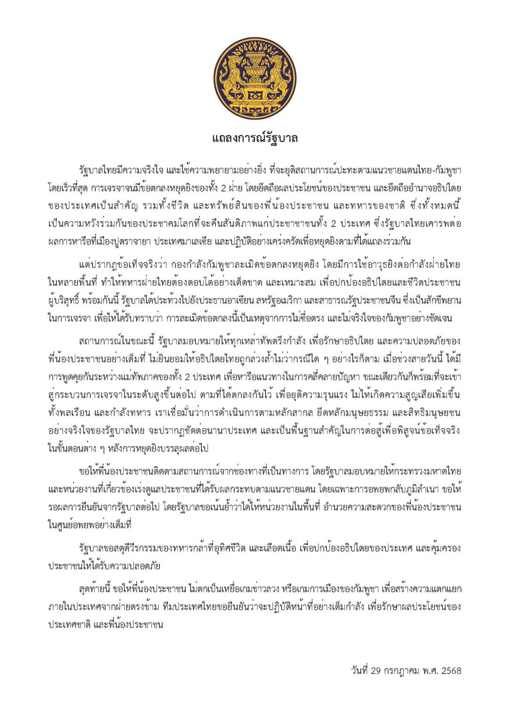 แถลงรัฐบาล หลังเขมรละเมิดข้อตกลงหยุดยิง ยื่นเรื่องประท้วงประธานอาเซียน, สหรัฐอเมริกา และจีน ให้รับทราบ เตือนอย่าตกเป็นเหยื่อข่าวปลอม