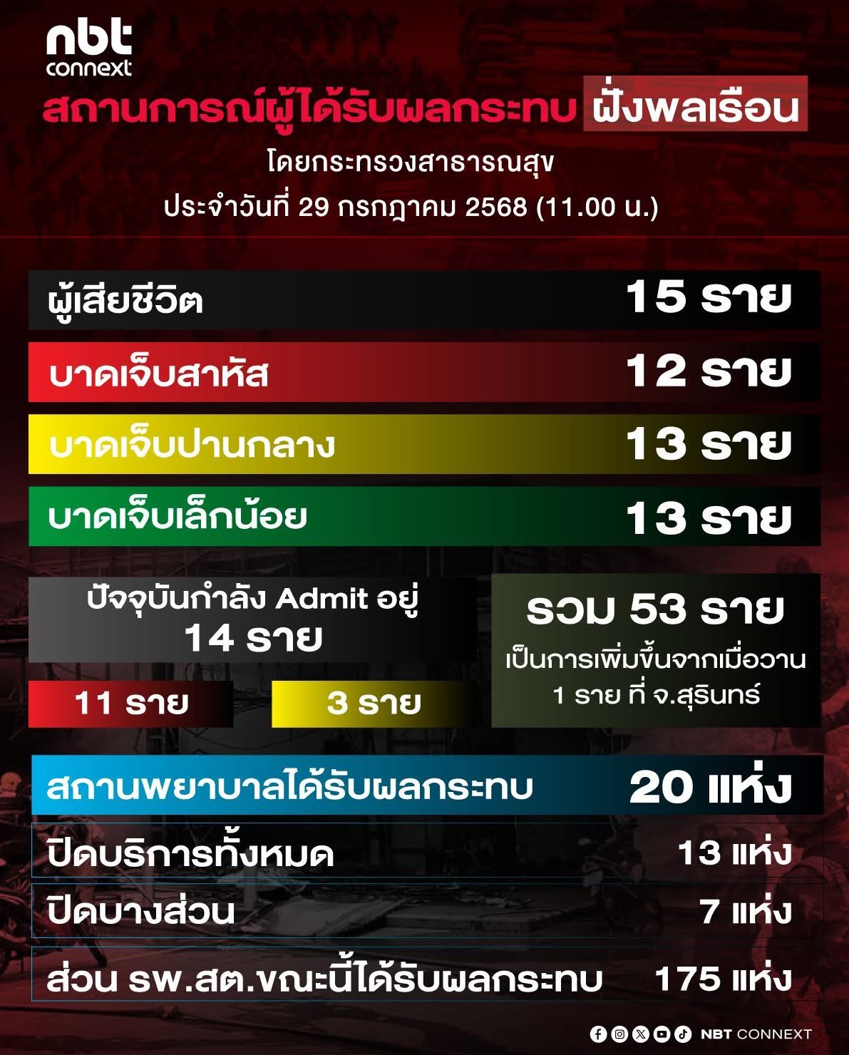 ทั้งนี้การอัปเดตสถานการณ์ชายแดนประจำวันนี้ (29 ก.ค.) กระทรวงสาธารณสุข แจ้งยอดเสียชีวิตของพลเรือนตอนนี้อยู่ที่ 15 ราย ส่วนกองทัพไทยระบุมีทหารกล้าสละชีพปกป้องแผ่นดินไปแล้ว 15 นายเช่นกัน.