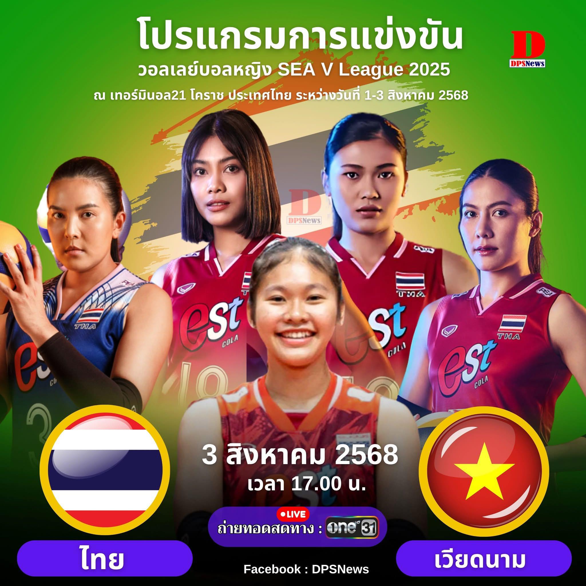 โหมโรงศึกวอลเลย์บอลหญิงซีวีลีก 2025 (SEA V.League 2025) สัปดาห์แรก ณ ศูนย์การค้าเทอร์มินอล 21 โคราช จังหวัดนครราชสีมา ประเทศไทย ช่วงระหว่างวันที่ 1-3 สิงหาคม 2568 โดยแมตช์นี้จะเป็นนัดสุดท้ายของสนามแรก “ทัพนักตบลูกยางสาวไทย” ทีมอันดับ 20 ของโลก จะลงสนามพบกับ เวียดนาม คู่แข่ง ทีมร่วมทวีปอันดับ 24 ของโลก