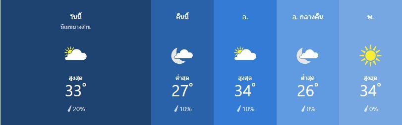 มีเมฆมากเป็นบางส่วน สูง 33เซลเซียส ความเร็วลม ใต้ ที่ 15 ถึง 30 กิโลเมตรต่อชั่วโมง