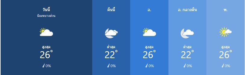 มีเมฆมากเป็นบางส่วน สูง 26เซลเซียส ความเร็วลม ตะวันออกเฉียงใต้ ที่ 15 ถึง 30 กิโลเมตรต่อชั่วโมง
