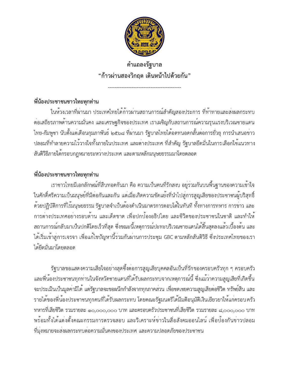 รัฐบาลไทย ออกแถลงก้าวข้าม สองวิกฤติ ชี้เหตุปะทะชายแดนสิ้นสุดแล้ว กำลังเริ่มต้นเจรจาแก้ไขผ่าน GBC เยียวยาทหารกล้าที่เสียชีวิต 10 ล้าน