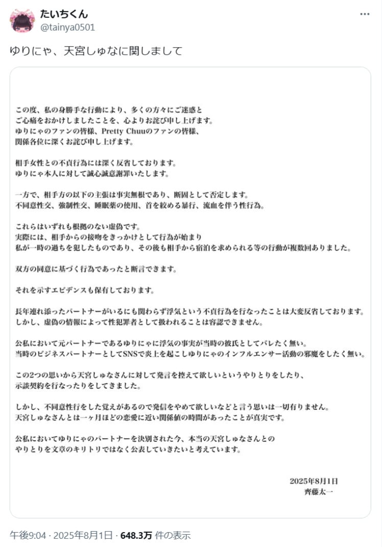 พร้อมกันนี้ เธอได้ประกาศตัดความสัมพันธ์ที่ยาวนานถึง 5 ปีครึ่งอย่างเป็นทางการ “ในฐานะคนรักที่เชื่อใจกันมาตลอด นี่เป็นการตัดสินใจที่เจ็บปวดอย่างมาก แต่ฉันขอประกาศตรงนี้ว่าจะไม่มีความเกี่ยวข้องใดๆ กับนายไซโต ไทจิ อีกต่อไป”