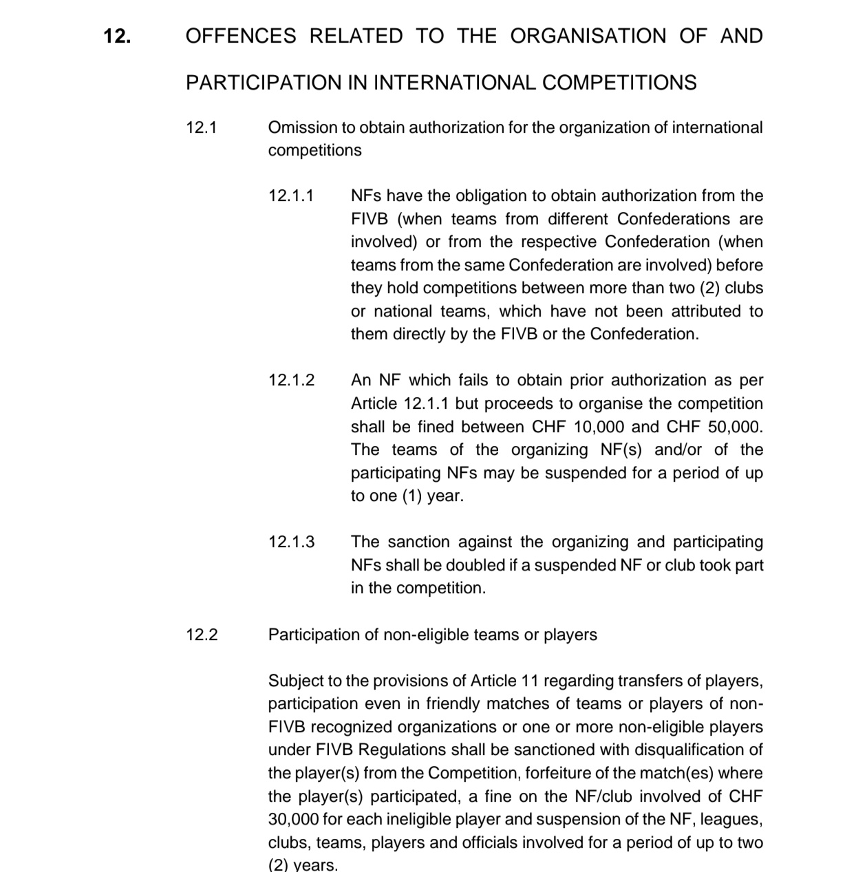 กฎข้อ 12.2 เขียนไว้ว่า การมีส่วนร่วมของทีมหรือผู้เล่นที่ไม่มีสิทธิ์แข่งขัน ภายใต้บทบัญญัติของข้อ 11 เกี่ยวกับการโอนย้ายผู้เล่น การมีส่วนร่วม แม้กระทั่งในแมตช์กระชับมิตรของทีม หรือผู้เล่นจากองค์กรที่ไม่เป็นที่ รับรองโดย FIVB หรือมีผู้เล่นที่ไม่มีสิทธิ์แข่งขันหนึ่งคนหรือมากกว่านั้น ตามข้อบังคับของ FIVB จะถูกลงโทษดังนี้