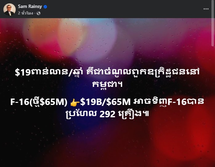 ไม่รู้ว่าหมายถึงใคร เพราะล่าสุด สม รังสี อดีตผู้นำฝ่ายค้านกัมพูชา ได้โพสต์ว่า “อาชญากร” ในเขมรมีรายได้ 1.9 หมื่นล้าน ซึ่งสามารถซื้อ F-16 ได้ถึง 292 ลำ