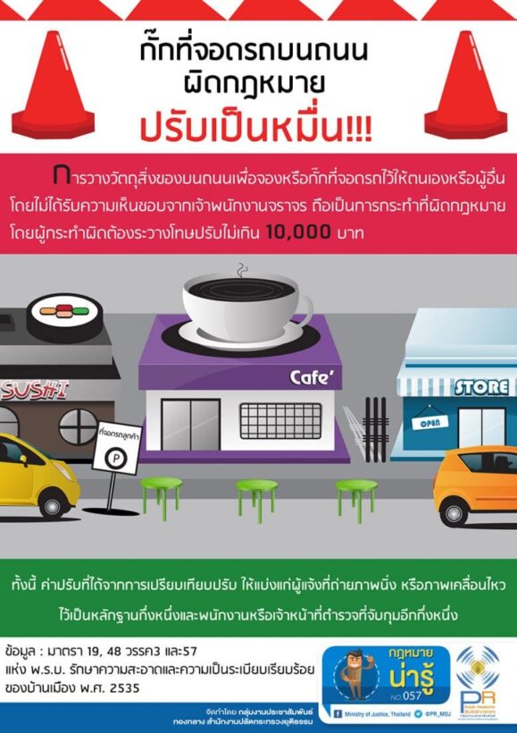 หลายคนคงเคยเจอปัญหาการจะนำรถเข้าจอดเทียบแล้วเจอเก้าอี้ ขวดนี้ ป้าย หรือกรวยตั้งขวางบริเวณที่จะจอดรถ ทั้งที่พื้นที่ตรงนั้นเป็นที่สาธารณะ ท่านรู้หรือไม่ว่าการกระทำแบบนั้นมีความผิด และมีโทษปรับหลายบาท โดยมาตรา 19,48 วรรค 3 และ 57 9k, พ.ร.บ.รักษาความสะอาดและความเป็นระเบียบเรียบร้อยของบ้านเมือง พ.ศ. 2535 บอกไว้ว่าว่าการวางวัตถุสิ่งของบนถนน เพื่อจองหรือกั๊กที่จอดรถไว้ให้ตนเองหรือผู้อื่น โดยไม่ได้รับความเห็นชอบจากเจ้าพนักงานจราจร ถือเป็นการกระทำที่ผิดกฎหมาย มาตรา 19, 48 วรรค 3 และ 57 แห่ง พ.ร.บ. รักษาความสะอาดและความเป็นระเบียบเรียบร้อยของบ้านเมือง พ.ศ. 2535 ผู้ใดกระทำผิดมีโทษปรับไม่เกิน 10,000 บาท และหากผู้ใดพบเห็นสามารถแจ้งจับได้ โดยผู้แจ้งจะได้รับส่วนแบ่งในการปรับครั้งนี้